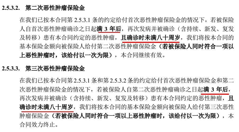 首次恶性肿瘤保险金给付后,再次确诊恶性肿瘤,不仅需要满3年间隔期,且需满足确诊时被保险人未满80周岁的条件。若首次恶性肿瘤保险金给付后被保险人已满80周岁,合同直接终止,假设在81周岁确诊第二次癌症,很遗憾,已经赔不了了。