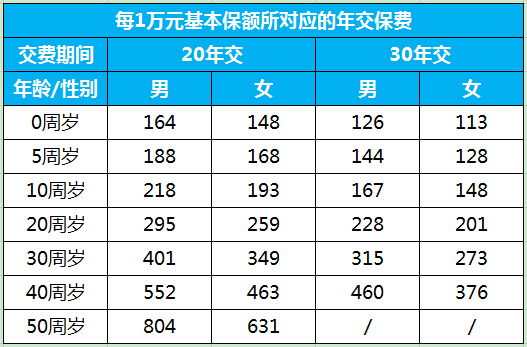 1、如10岁的男孩,每1万保障,选择交20年,则每年交保费218元,10万保障即每年交2180元;若选择30年交,只需167元,10万保障每年交1670元;