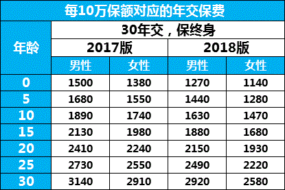 沃保小结:上述两个表格都是10万保额对应的年交保费,其他额度对应的年交保费=上表费率×份数。例如,0岁女孩选“2018版”30年交,20万保额对应的年交保费=1140×2=2280元。(单位:10万保额/份)