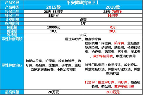 从以上二表可以看出,相较于平安健康抗癌卫士2015,平安健康抗癌卫士2018款的性价比可以说是高到令人发指!以30岁男士为例,后者计划一只需要242元就可以拥有200万元保额,而前者需要花费3331元才能拥有100万元保额,更何况实际上前者年度最高保额只有20万元,多次投保的保额最高限额才是100万元(也就是最多可以赔付五次),这意味着消费者要多次投保而且花更多的钱才能享受同样的保额保障。