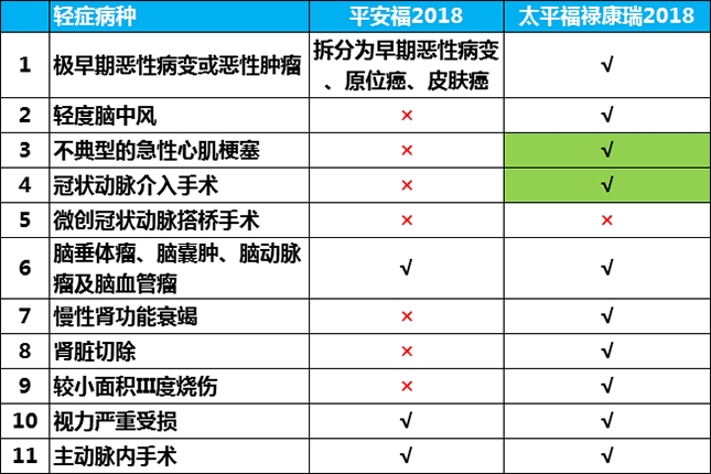 如上图所示,福禄康瑞2018的高发轻症覆盖更全面,平安福2018对高发轻症的覆盖不全面,常见高发的轻度脑中风、不典型的急性心肌梗塞、冠状动脉介入手术都不在保障范围内。