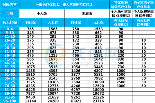 沃保小结:上表为该产品升级款的保费详情,一般医疗保障和重疾医疗保障是必选项,所以保费是一起算的;特定疾病保障和质子重离子保障是可选项,所以是另外收费的,但保费也不贵。
