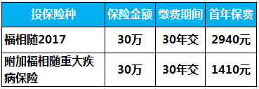 0岁宝宝购买富德生命福相随2017保障计划,30年交,首年保费4350元,保额30万,具体如下: