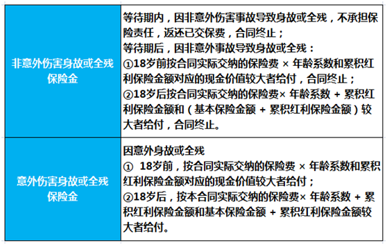 18-40岁: 1.6倍的主险已交保费/300000元较大者+累积红利+终了红利;