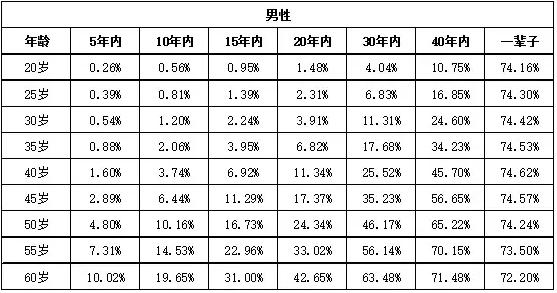 数据来源:中国保监会颁布的《中国人寿保险行业经验生命表(2000-2003)》以及《中国人身保险业重大疾病经验发生率表(2006-2010)》非养老金生命表。