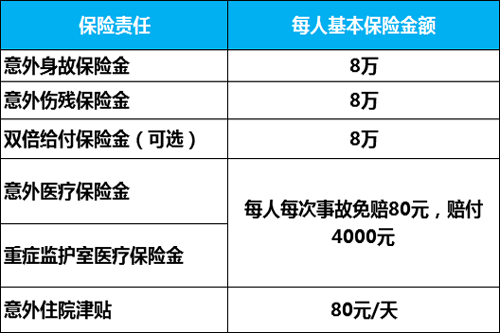 双倍给付保险金(可选):被保险人发生以下情形之一遭遇意外伤害事故身故或伤残,则在给付一倍的基本保额,具体情形包括①以乘客身份乘坐在公共交通工具内;②在一般载客用升降机或手扶电梯内(矿场及任何建筑工地升降机除外)。