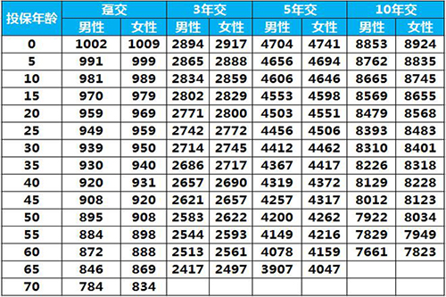 上图为部分保险金额表,每份趸交或年交保费1000元。终身寿险主要承担身故责任,也是财富的传承,目标人群一般为是中高收入阶层,因此保费相对也较贵一些。