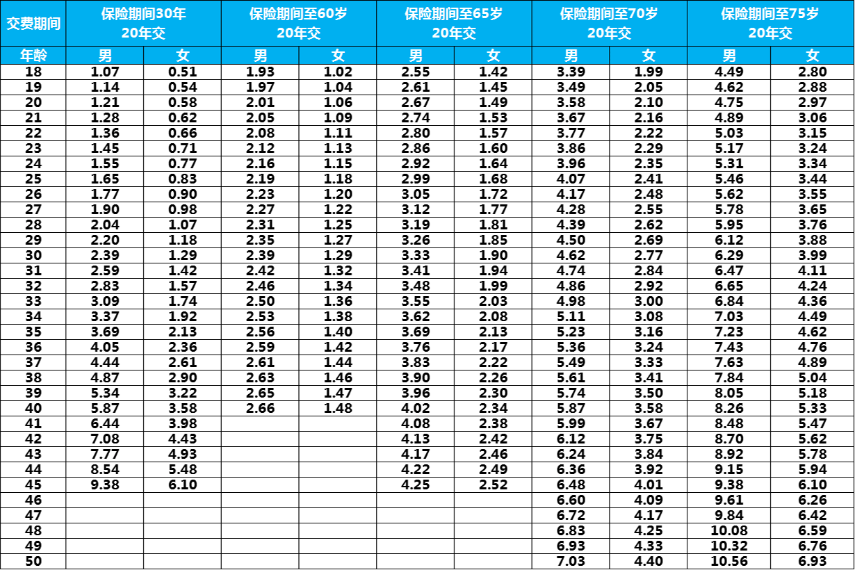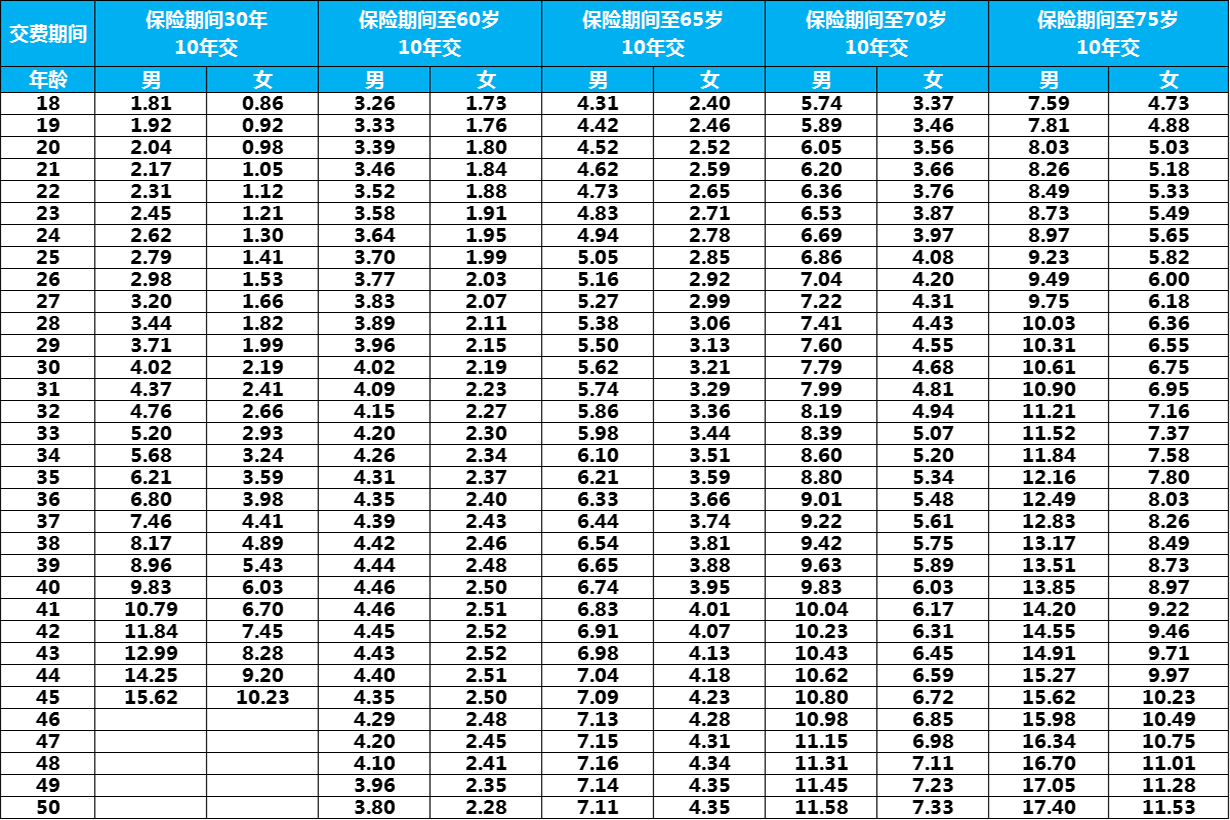 中华怡恒定期寿险费率表(不区分是否吸烟,统一保费)
