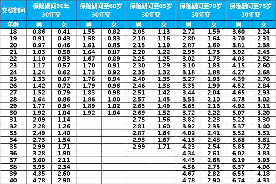 30岁(男),保至60岁,年交保费4020元;保至65岁,年交保费5620元;保至70岁,年交保费7790元;保至75岁,年交保费10610元。