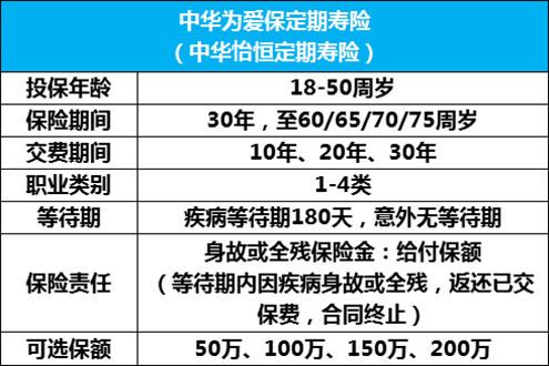中华为爱保定期寿险(即中华怡恒定期寿险),意外、疾病导致的身故或全残都保障,保险期间有30年、至60周岁、至65周岁、至70周岁、至75周岁五种期间可选择,满足消费者多样需求。10年交、20年交、30年交,三种交费期间可灵活选择,最长30年交费期间,有效减轻年缴费压力。最低保额50万,最高保额200万,满足家庭风险保障额度。