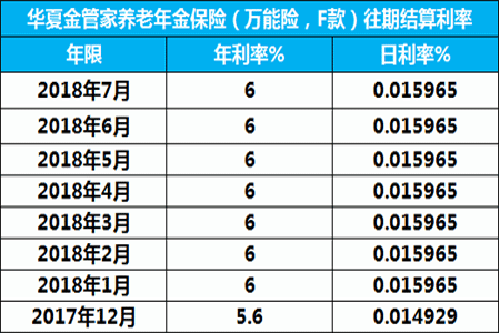从上表可以看出华夏金管家养老年金保险(万能险,F款)最高时候的利率为6%,最低时候的利率为5.6%,它的保证利率是3%,每年的结算利率不能低于保证利率。
