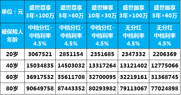 1、在总投入保费均为300万的情况下,交费期间越短,收益越高,这是因为交费期间短的,年投入的保费就更多,本金积累更快,更早开始进行利益累积。所以如果经济实力足够强的,可以选择3年交费,经济实力长期稳定的,可以选择较长的交费期间。