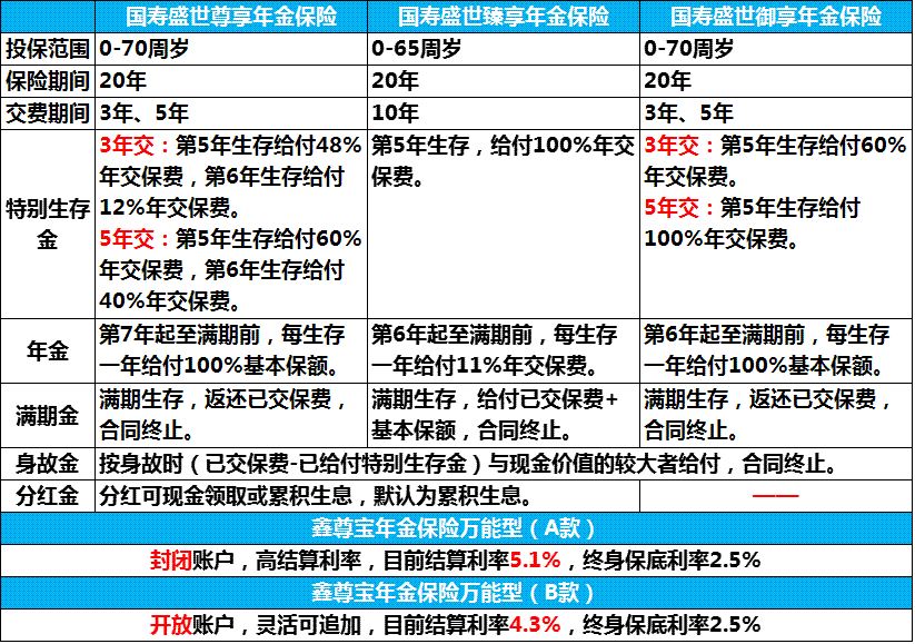 3、在保险责任上,三款产品均具备首笔权益高、年金给付稳、财富积累快、满期领取早等特点。关于特别生存金,3年交的特别生存金共返还60%年交保费;5年/10年交的特别生存金共返还100%年交保费。关于年金的给付,盛世尊享从第7年开始给付,盛世臻享和盛世御享从第6年起开始给付。三款产品均在20年满期生存时给付满期金,都有身故保障,并且搭配的万能账户都是鑫尊保双账户。