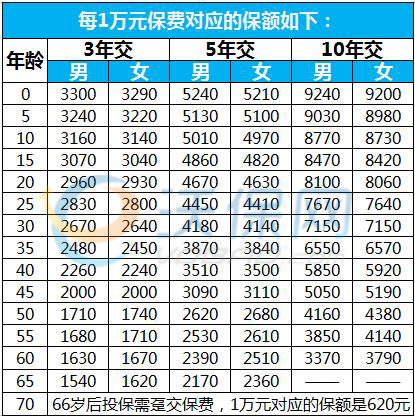 沃保网小结:上表费率演示的是1万元保费对应的保额,其他保费对应的保额按上表额度直接相乘即可。例如,0岁男孩选3年交预算5万/年:对应的额度=3300×5=16500元;30岁先生选5年交预算10万/年:对应的额度=4180×10=41800元。