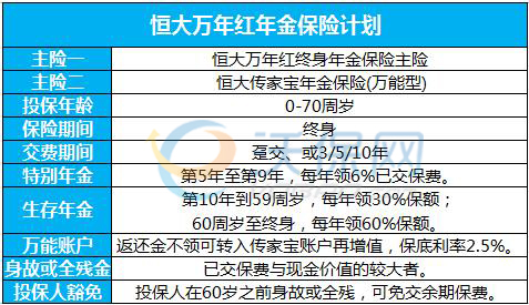 恒大万年红搭配的万能账户传家宝超给力,趸交只要100元,相当于投保万年红免费送万能账户了。这点比其他同类年金险搭配的万能账户来说确实是很大的优势,很多相似产品可能也是收100元,但他们很多是每年都要收100元、或者是首年100元,次年起就不止100元了。然而,万年红搭配的传家宝是一辈子增值收益只收100元哦!