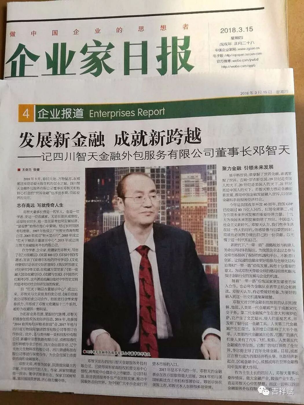 在很多人眼里,邓智天是学识渊博、头脑敏锐、富有情趣、具有强烈家国情怀的一位企业家。邓智天喜爱收藏、善于写作,其创办的四川智天金融服务外包有限公司等企业、平台更是具有相当大的影响力,对于我国,甚至世界金融业的发展具有重要意义。