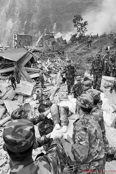 外面的几位叔叔立即找来木棒、钢钎,合力撬起压着他的水泥板,趴在他身边的叔叔顺势将他拉出抱起,另两位叔叔轻轻蒙住他的眼睛、护着他的头,小心翼翼钻出废墟。