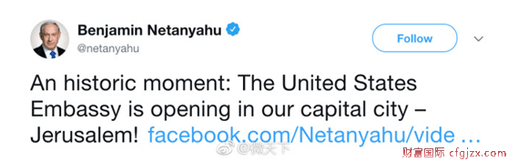 内塔尼亚胡表示:“历史性的一刻,美国大使馆开在了我们的首都——耶路撒冷!”