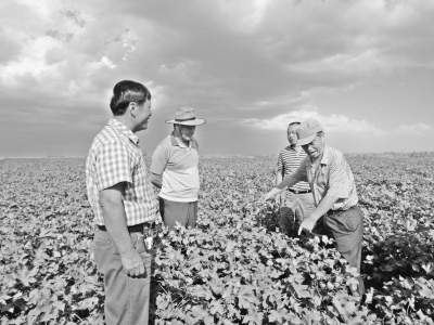 | 8月18日~24日,国欣农村技术服务总会组织专家到新疆4万亩棉花基地考察棉花新品种长势。该基地采用有机肥作基肥、大量元素水溶肥作追肥,保障了棉花养分的精准供给,预计今年亩产籽棉400公斤。图为农艺专家与基地负责人交流棉花田间管理经验。 |