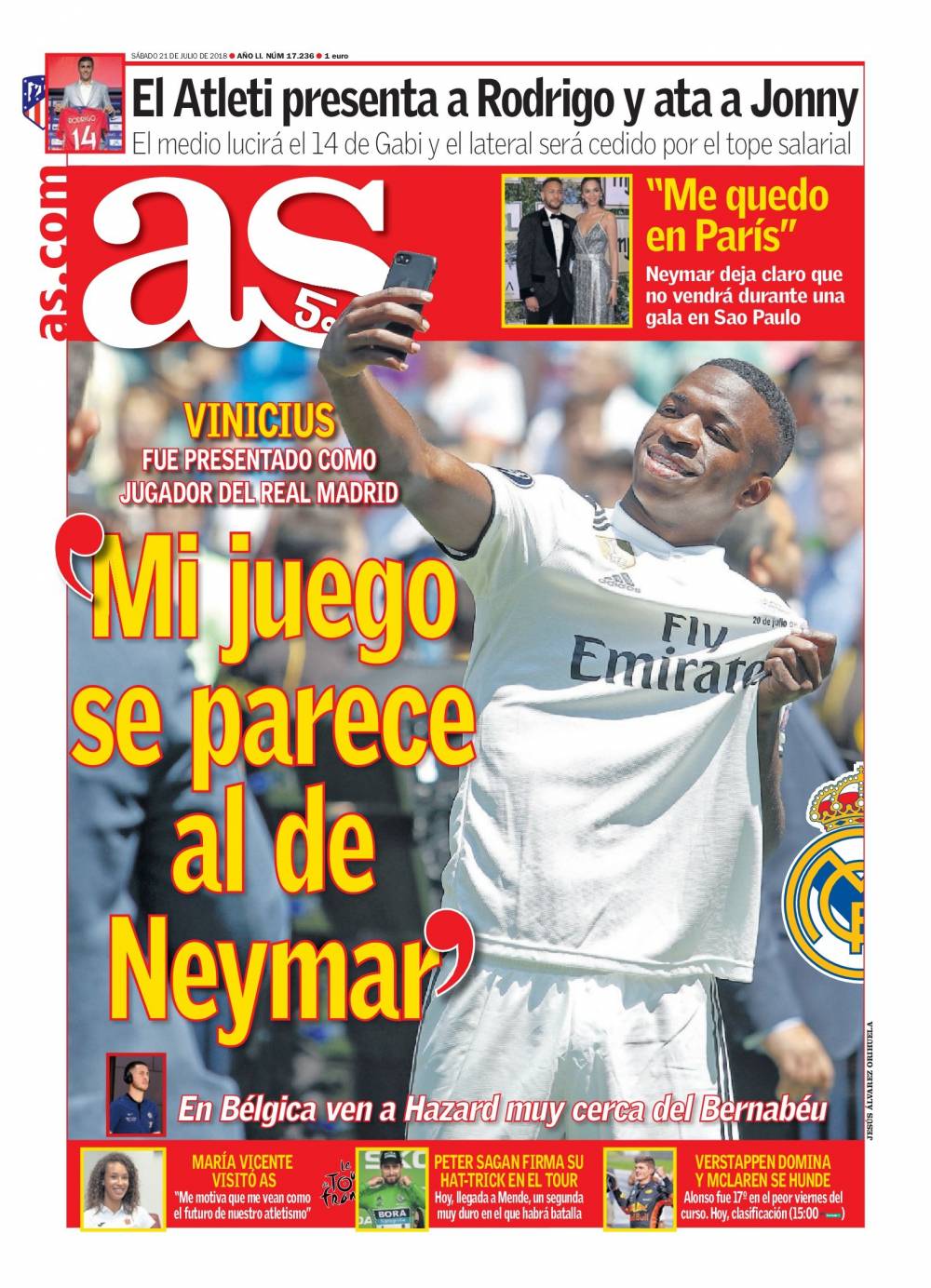 1 、维尼修斯正式表态皇马,他暗示,"我的气概和内马尔很近似." 比利时媒体则称阿扎尔接近加盟皇马.