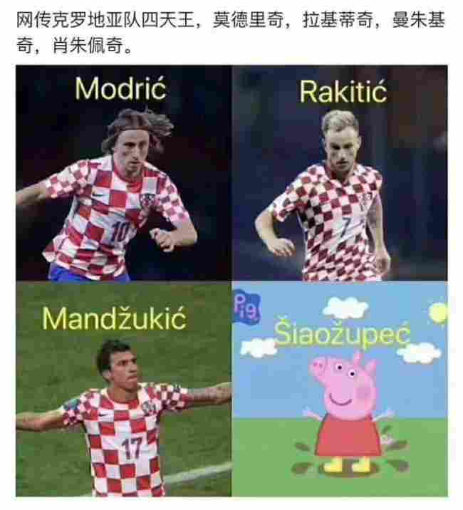 其二就是拉出来“社会人”小猪佩奇。尽人皆知,克罗地亚队队员们的名字里城市带有一个“奇”,这也让球迷们脑洞年夜开,直接把“肖朱佩奇”给放进了克罗地亚队的“年夜名单”,意图让小猪佩奇带给克罗地亚队好运。因而可知,球迷们为了克罗地亚队夺冠,也真是蛮拼的。