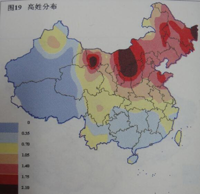 高姓人口单位面积内密度最高的地区在山东、河北、江苏、安徽、浙江北部、湖北东部、甘肃西部、东北三省、内蒙古东部,每平方公里的高姓人口达到2.7人以上,尤其在山东中部的地区高达6.4人。高姓分布密度表明:密度最高的(2.7万人以上/平方公里)地区占国土面积的18.1%,高姓人口大约641万;0.9-2.7万人/平方公里的地区占国土面积的42.2%,高姓人口大约719万;不足0.9万人/平方公里的地区占国土面积的39.7%,高姓人口大约92万。高姓分布很广,但不均衡。高姓在人群中分布频率表明:高姓在华北、东北、西北地区是比较常见的姓氏之一,一般占当地人口的比例达最高,在1.2%以上,尤其在甘肃河西走廊、山东中部、陕晋北部、黑龙江东北,在1.8%以上,有的达到3.6%以上,这部分高比例的地区的覆盖面积约占了中国总面积的29.2%;在四川、重庆东部巫山,奉节、湖北大部及利川、湖南北部、江西、浙江、福建、台湾、广东东部、青海东部、新疆西北,高姓频率在0.6%-1.2%,其覆盖面积约占了中国总面积的30.5%;其他广大地区,高姓频率不足0.6%,其覆盖面积约占了中国总面积的40.3%。zka财富国际