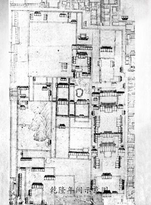 金默玉没有赶上肃王府的鼎盛年代。那时候北京有一句话:“恭王府的房子,豫王府的墙,肃王府的银子用斗量。”1918年金默玉出生的时候,父亲已经在东北流亡6年了。虽然是流亡,但王室的生活与作派在很长一段时间里并没有改变,规矩多多:“没有了皇上和太后,祖宗的牌位还在,逢年过节,一定要拜祭;同族的亲戚也还在,请安的时候,失了礼节,就成了大笑话。”说起现在的清宫戏,金默玉觉得可笑:“动不动就‘喳’、‘喳’,你‘扎’谁呢?那字儿念‘zhe’。”图为乾隆年间肃王府示意图。