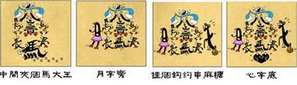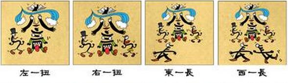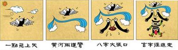 “一点戳上天,黄河两头弯。八字大张口,言官朝上走。你一扭,我一扭,一下扭了六点六。左一长,右一长,中间夹了个马大王。心字底,月字旁,拴钩搭挂麻糖。推着车车走咸阳。”