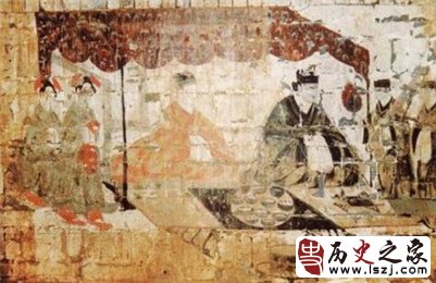 中室四壁绘的室墓主人“出行图”,上下共四层,每层均有大量车、骑及伍佰(武官)、辟车(文官)之类的导从,和一辆主车。最下一层主车的乘者室墓主人,后面室辎?蕹?,乘者室墓主人的妻子。