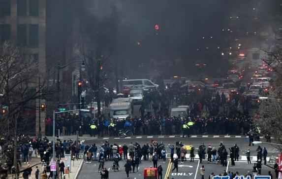 1月20日,在美国首都华盛顿,发生抗议的13街冒起浓烟。在欢呼和抗议声中,唐纳德·特朗普20日中午在华盛顿国会山宣誓就任美国第45任总统,发表以“唯有美国第一”为主旨、以保护主义为主基调的就职演讲。就职典礼前夕,美国社会各界“反特”声音也越来越大。华盛顿警方说,217名抗议者被逮捕。
