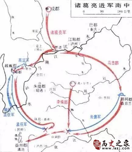 首先,从地理位置上看,三国时期的南中,指现在的云南东北部、贵州西部和四川东南部,当时是蜀国的一部分,古称为“夷越之地”。诸葛亮是建兴三年三月从成都出发,四月平越隽(今四川西昌东南),五月渡泸(金沙江),至秋,四郡(越隽、建宁、牂柯、永昌)俱平,取道滇东北,冬至汉阳(今四川庆符),大约十二月回到成都的。我们来拿出地图好好划一下~